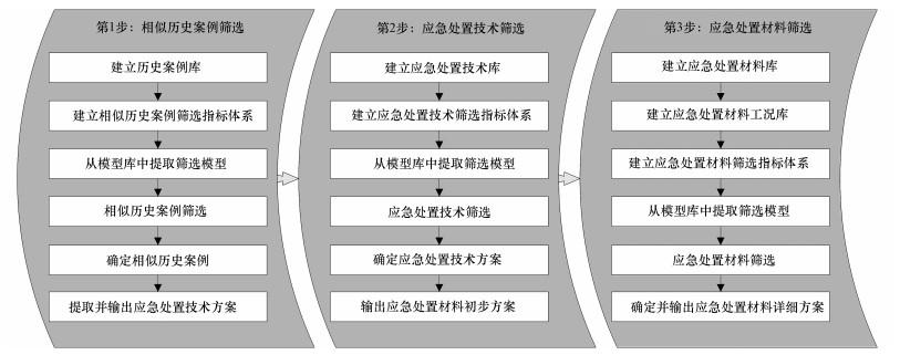 應(yīng)急處置技術(shù)預(yù)案(方案)可拆分為“案例-技術(shù)-材料”3個(gè)子系統(tǒng),建立“相似歷史案例篩選→應(yīng)急處置技術(shù)篩選→應(yīng)急處置材料篩選”的“三步篩選法”框架.三步篩選法決策模型思路清晰、可操作性強(qiáng),其框架結(jié)構(gòu)如圖 1所示,技術(shù)路線及可采用的決策模型歸納梳理如下.
