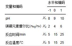 在參考已有的文獻基礎上,選取4個主要的影響因子:pH(X1)、鎂磷元素摩爾比(X2)、反應時間(X3)和反應溫度(X4),在單因子分析的基礎上初步確定了各工藝條件的優(yōu)化區(qū)間,進而采用Box-Behnken響應曲面模型設計試驗方案,所考察的變量和水平見表 2.