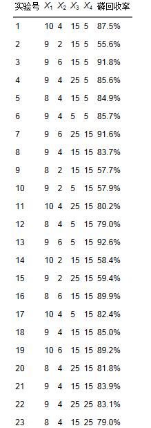 以pH、鎂磷元素摩爾比、反應時間和反應溫度為自變量,以對高鐵糞便污水中磷的回收率(%)為響應值建立模型為: