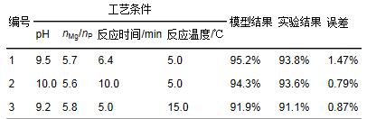回歸方程(2)存在極大值,通過解模型逆矩陣得到極大值所對應的各主要因素的編碼值,即最優(yōu)工藝參數(shù)為:pH為9.5,nMg/nP 為5.7,反應時間為6.4 min,反應溫度為5.0 ℃,磷的回收率響應值可達到95.3%.