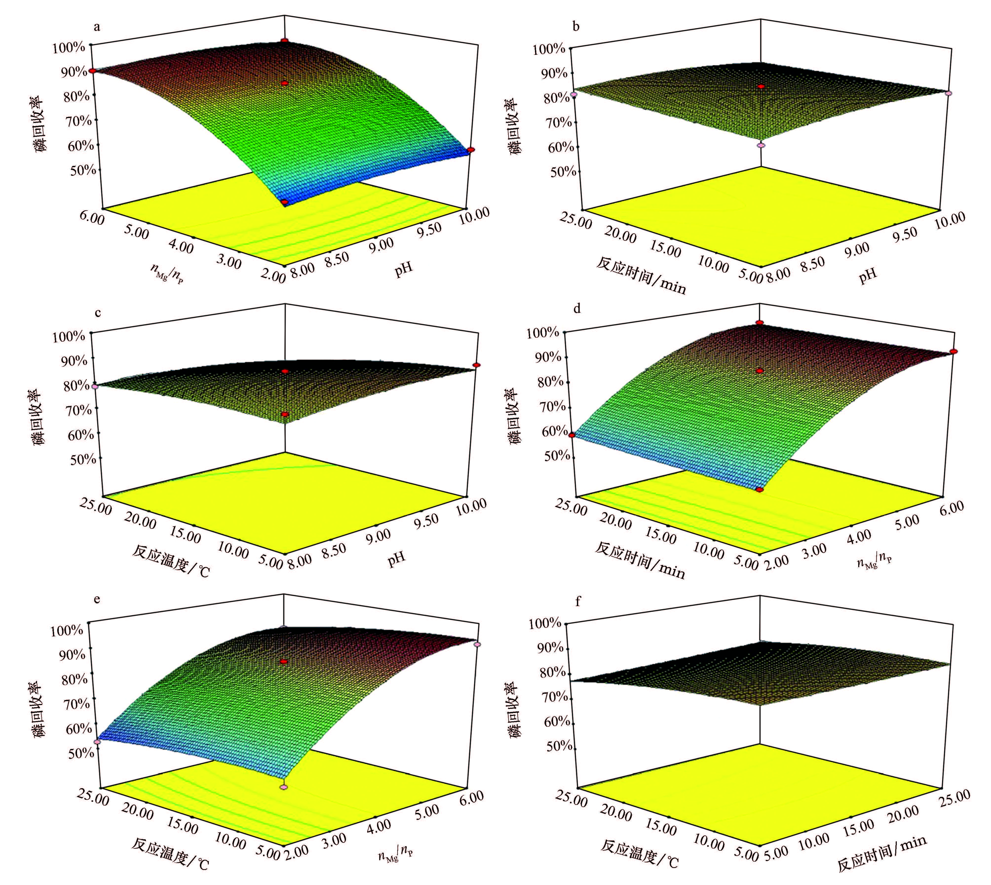 圖 1e顯示了pH和反應時間在中心值的條件下,nMg/nP和反應溫度對高鐵糞便污水中磷回收率的交互影響.由圖 1e可知,磷回收率更受nMg/nP的影響,隨著nMg/nP的增加,磷回收率出現(xiàn)增加;磷回收率受反應溫度的影響較小,隨著反應溫度降低,磷回收率略有增加.