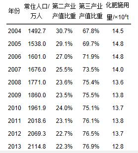 表 2 2004-2013年北京市人口、第二、三產業產值比重以及農業化肥施用量