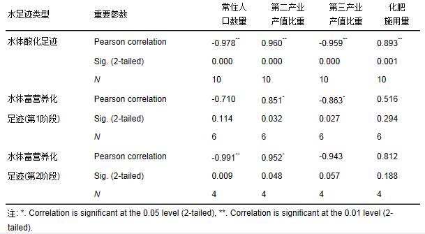 為了定量分析水劣化足跡與所選城市發展指標之間的相關關系, 運用SPSS數據分析軟件, 分別對水體酸化足跡、水體富營養化足跡及以上4個指標進行相關性分析.其中由于水體富營養化足跡的跳躍性變化, 相關性分析也分別針對兩個階段展開, 分析結果如表 3所示.