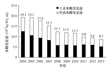2004-2013年, 北京市水酸化足跡逐年降低, 由2004年的19.1×107 kg SO2 eq到2013年降低為8.7×107 kg SO2 eq, 減少了約54.5%.2004-2008年變化速率較快, 之后變化速率有所減緩.從其組成變化來看, 工業水酸化足跡所占比重較大, 生活水酸化足跡比重較小且仍在減少.說明工業和生活二氧化硫的排放量均有所減少, 但生活二氧化硫排放量減少的速度較工業二氧化硫更快.