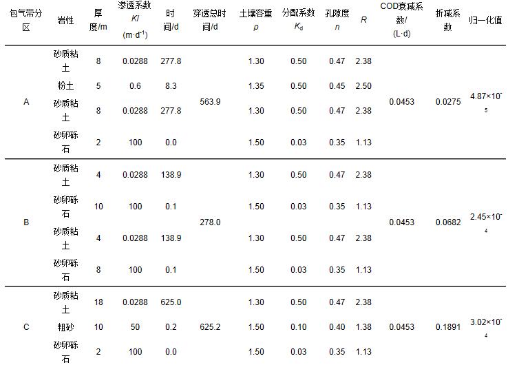 然而, 實際情況中包氣帶介質垂向結構十分復雜, 由不同類型的土壤介質組成, 每一種土壤介質都有不同的阻滯系數, 而且每一種土壤介質的厚度及滲透系數都不同, 所以, 污染物穿透每一層土壤介質的時間t也不同.按照土壤介質結構順序, 把包氣帶介質分成多個部分, 每一種介質作為一個單獨的均質結構, 使用上述均質公式(4)進行計算, 將在包氣帶介質中發生吸附作用(或者吸附作用和降解作用)后流出的該部分的污染物液相濃度作為進入下一個均質部分的初始濃度進行計算, 其他各個土壤介質遵循同樣的方法, 最終從最后一個土壤介質類型中流出的液相濃度即為污染物穿透整個包氣帶厚的出水濃度.由于每個水文地質區包氣帶介質的厚度也不同, 因此, 本研究中將計算出的折減系數進行歸一化處理, 污染物在每一個水文地質分區內的歸一值為該污染物穿透包氣帶介質后的量與水流穿透該包氣帶介質厚度的時間t的比值.