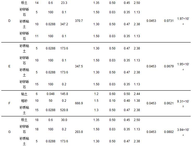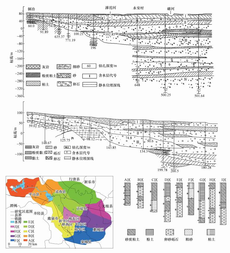 對石家莊平原區包氣帶介質進行分區概化, 共概化為9個不同類型包氣帶介質(圖 4c), 分別為A、B、C、D、E、F、G、H和I區, 對于每個地質區包氣帶巖性剖面參考相應區域整體包氣帶屬性來代替整個水文地質區的巖性.巖性剖面用典型的鉆孔巖性來代替整個水文地質區的巖性, 包氣帶巖性分區概括如圖 4d所示.