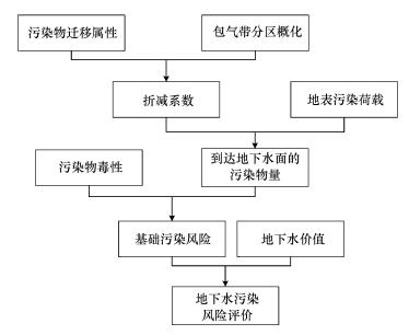 該體系分為4個層次, 首先, 根據包氣帶介質分區及每種污染物遷移屬性得到每一種污染物對應每一個包氣帶分區的折減系數;然后, 由該污染物進入包氣帶的量與折減系數相乘得到該污染物到達地下水面的量;其次, 將到達地下水面的污染物量與污染物危害性疊加得到基礎地下水污染風險;最后, 將基礎地下水污染風險與地下水價值疊加得到地下水污染風險.該體系重在刻畫污染物在包氣帶中的衰減過程, 是從污染物通過包氣帶時量的衰減和危害性不變的本質層面考慮的.