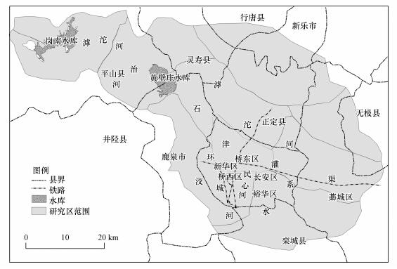 石家莊地處河北省中南部, 位于北緯37°26′~38°46′, 東經113°31′~115°29′之間.本次研究區主要包括石家莊市區、鹿泉市、正定縣、靈壽縣與平山縣區域, 研究區位置與范圍如圖 2所示.區內最大河流為滹沱河, 所形成的河床及河漫灘一般寬度為2000~4000 m.由于上游修建了黃壁莊水庫, 河水受到人工控制, 所以通常滹沱河河道內只有汛期才有水通過.研究區內有黃壁莊水庫與崗南水庫兩大水庫, 崗南水庫是河北省管轄的庫容最大的水庫, 崗南水庫與黃壁莊水庫主要作用以防洪為主, 并結合發電、農業灌溉、工業供水和省會石家莊城市生活、環境供水等為一體, 為石家莊最重要的水源地.