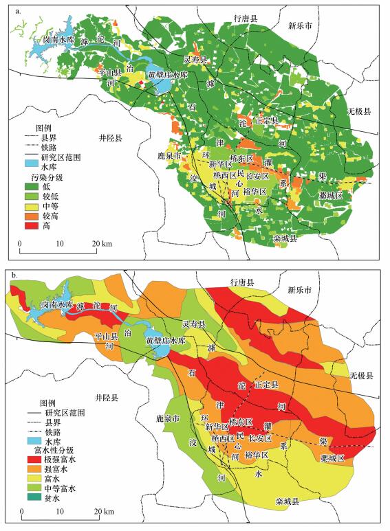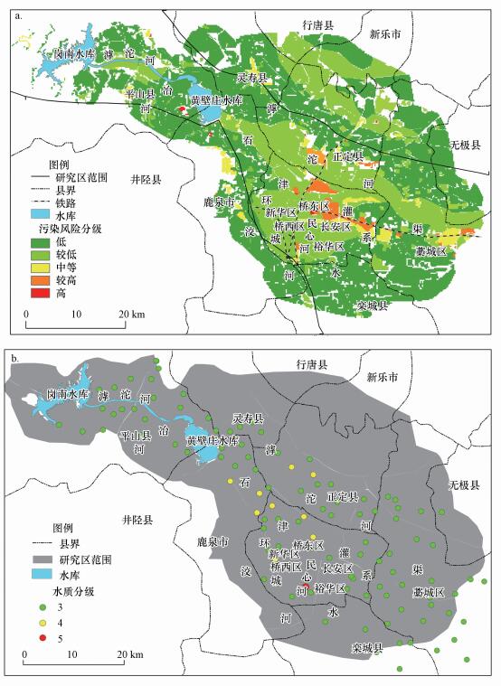 圖 6石家莊市平原區地下水污染風險評價結果及驗證(a.地下水污染風險分級, b.地下水采樣點水質分級)