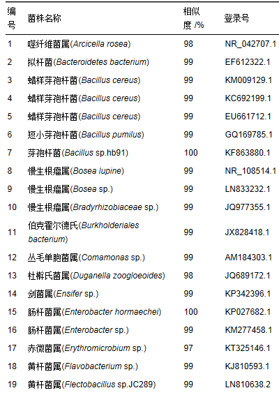 (3) 純化后的菌株置于滅菌的R2A液體培養基中培養,28℃,200 r·min-1于恒溫振蕩培養箱中培養14 h. 在其處于對數生長期時,取菌液5 mL,使用天根基因組DNA提取試劑盒提取基因組DNA,使用細菌通用引物27F和1492R擴增16S rRNA基因序列. PCR擴增體系為50μL,其中10×Taq buffer 5μL,dNTPs 4μL,引物各1.5μL(10 mmol·L-1),Taq酶 1.0μL,模版100 ng左右,超純水補齊. 擴增長度為1 400 bp. PCR反應條件為95℃: 5 min;95℃:30 s; 56℃:30 s; 72℃: 1.5 min,共30個循環,72℃延伸10 min. PCR擴增產物送至測序公司檢測,將測序結果在NCBI-Blast 數據庫中進行同源比對.
