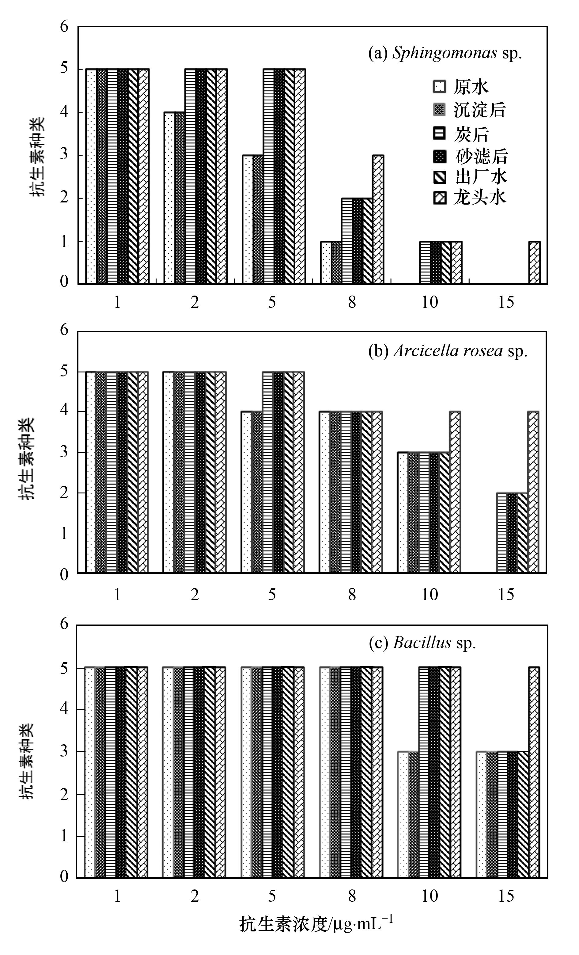 分別使用Amp、 Kan、 Cm、 Rif、 Str這5種抗生素配制濃度為1、 2、 5、 8、 10和15μg·mL-1的R2A培養基,倒平板,常溫下過夜. 分別接種涂布飲用水中分離純化菌株和振蕩后的水樣,28℃培養7d. 根據培養結果分析微生物多重耐藥性及飲用水凈水工藝對選擇菌株耐藥性隨抗生素濃度變化.