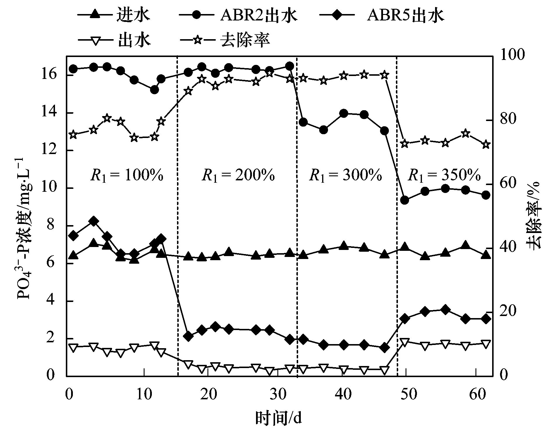 本研究中獲得工藝最佳同步反硝化除磷效果時的R1為300%,此時平均出水NH4+-N、 TN和溶解性PO43--P分別穩(wěn)定在0.73、 12.98和0.43 mg·L-1. R1過低使ABR第3隔室中NO3--N負荷過低,即無充足電子受體供DPB利用,從而影響除磷效果; 另一方面,大部分NO3--N未經(jīng)缺氧區(qū)反硝化除磷環(huán)節(jié)直接隨出水流出,這種“未脫先離”的現(xiàn)象致使TN去除率不高. 而R1過大使ABR第3隔室及后續(xù)隔室NO3--N過剩,反硝化菌會大量消耗ABR第二隔室的VFA,導致釋磷不充分,從而影響工藝的反硝化除磷效果; 另一方面,硝化液攜帶的DO隨R1增大而增多,破壞了缺氧環(huán)境,反硝化能力被削弱,致使TN去除率不高.