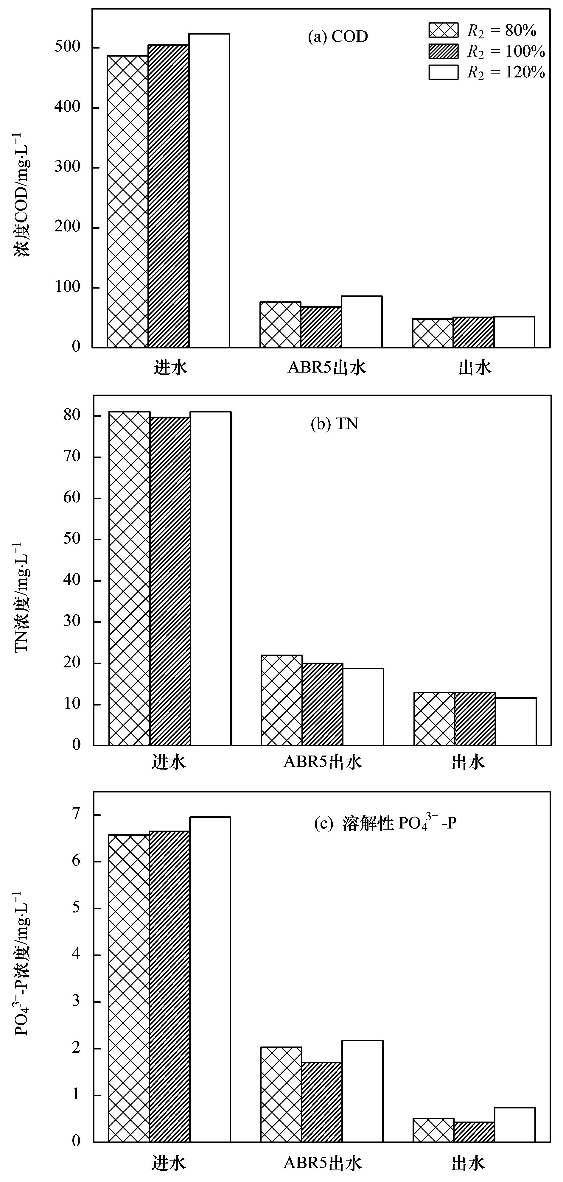 在最優(yōu)R1為300%下,設定3個不同R2: 80%、 100%和120%,圖 6為不同R2下各污染物的去除情況,出水COD濃度穩(wěn)定在50 mg·L-1左右,R2變化未影響本工藝對COD的去除. 在R2為80%、 100%和120%時,出水TN分別為13.46、 12.98和11.68 mg·L-1,隨著R2的增大,出水TN濃度呈下降趨勢. 隨著R2的增大,更多NO3--N在ABR第2隔室進行反硝化,故在R1保持不變時,出水TN濃度隨R2增大而減小. 污泥回流是導致厭氧段反硝化菌與DPB產(chǎn)生碳源競爭矛盾的主要原因,R2的大小直接影響ABR第2隔室中釋磷量從而影響反硝化除磷效果. 當增大R2至120%時,ABR出水溶解性PO43--P濃度升高至0.74 mg·L-1,這可能是由于隨R2增大,更多的NO3--N回流至ABR第2隔室優(yōu)先進行反硝化,使DPB內儲存的內碳源的量較少,導致缺氧吸磷減弱,從而造成除磷效果下降. 較大的R2必然會對除磷造成負面影響,在保證TN有效去除的前提下,無需維持較大的R2. 因此,本研究中R2為100%時獲得最佳反硝化除磷效果.具體參見污水寶商城資料或http://www.xhxdt.com更多相關技術文檔。