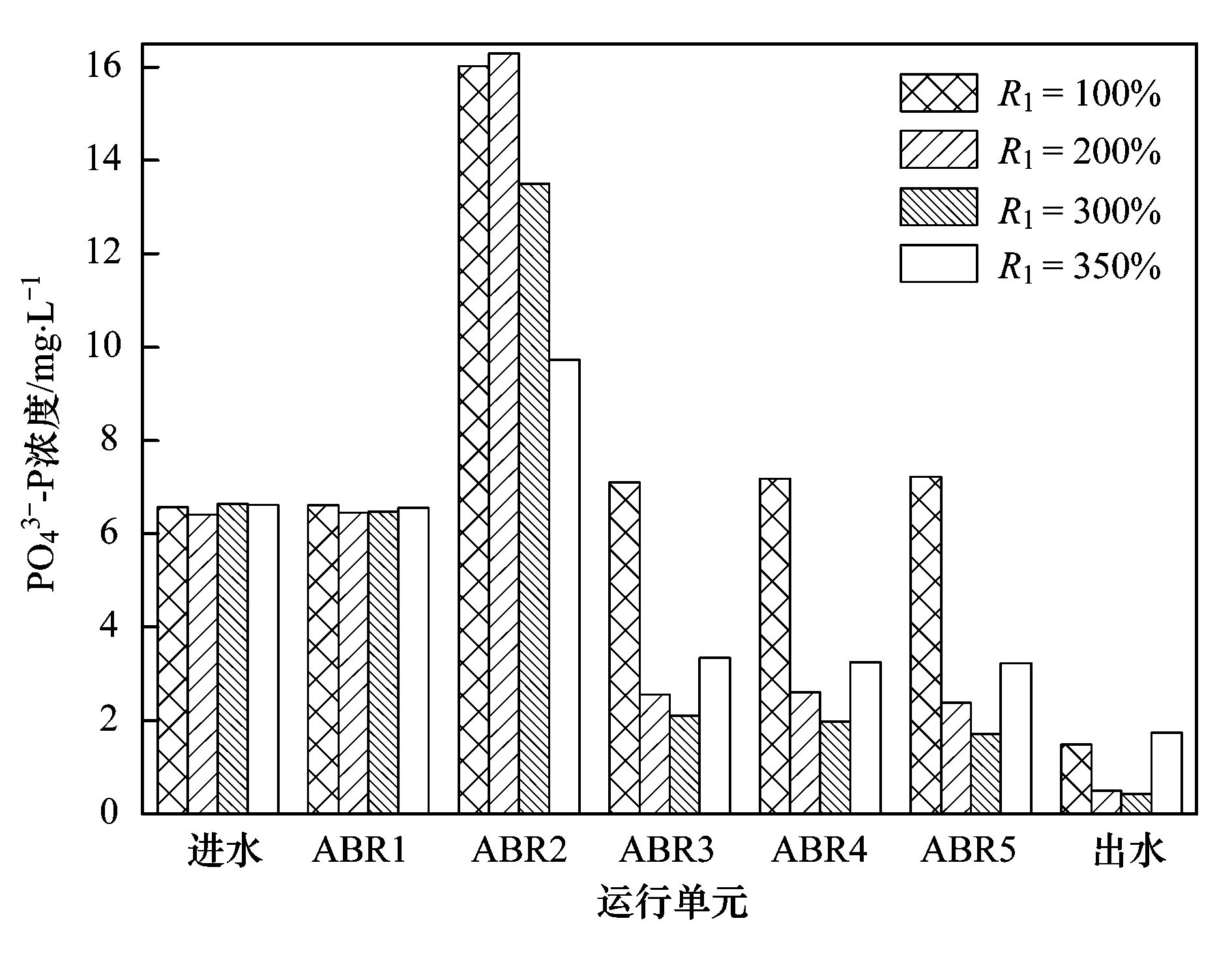厭氧段能否充分釋磷是決定反硝化除磷效果的關鍵因素之一. VFA是可供反硝化除磷菌利用的唯一碳源,其他有機碳源只有經(jīng)過水解酸化為VFA才能被利用. 本研究在ABR第2隔室為DPB創(chuàng)造適宜條件,充分吸收經(jīng)ABR第1隔室水解產(chǎn)生的優(yōu)質碳源合成PHB并完成磷的釋放. 而R1過大會影響厭氧段釋磷量,為獲得不影響厭氧段釋磷的最優(yōu)回流比,對不同R1條件下ABR第2隔室釋磷情況進行了研究.