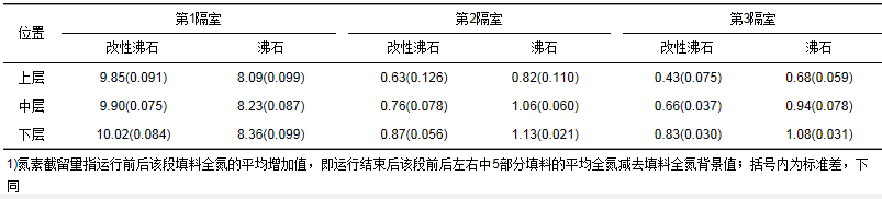 濕地填料沿程各段的氮素截留量見表 3,改性沸石濕地第1隔室填料平均氮素截留量比沸石濕地多了17%,說(shuō)明在改性過程中低價(jià)金屬離子有效地取代了沸石晶格中的Si4+,且于實(shí)際應(yīng)用中發(fā)揮了作用,兩種沸石在第1隔室的氮素截留量遠(yuǎn)高于靜態(tài)吸附試驗(yàn)中得到的吸附量.與靜態(tài)吸附試驗(yàn)錐形瓶中氮素總量恒定不變不同,實(shí)際運(yùn)行中不斷有新氮源與填料接觸,填料對(duì)氮素始終保持較高的吸附推動(dòng)力,吸附點(diǎn)位的利用更為充分,從而吸附了更多的氮素.
