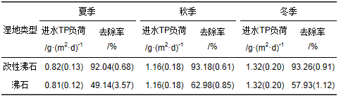 季節(jié)變化對(duì)濕地除磷效果的影響見表 6,為減輕TP負(fù)荷不同對(duì)處理效果的影響,選取沸石濕地進(jìn)水TP負(fù)荷在0.85~1.05 g·(m2·d)-1間的數(shù)值結(jié)果進(jìn)行比較發(fā)現(xiàn),相較夏季,沸石濕地在秋季的TP去除率提高了8.33%,且穩(wěn)定性更高.植物的繼續(xù)生長(zhǎng),泌氧能力的加強(qiáng),磷素形態(tài)轉(zhuǎn)化速率加快,濕地內(nèi)生物量不斷增加,生物膜的生長(zhǎng)成熟是濕地除磷效果和穩(wěn)定性增強(qiáng)的主要原因.對(duì)沸石濕地進(jìn)水TP負(fù)荷在1.06~1.50 g·(m2·d)-1間的數(shù)值結(jié)果進(jìn)行秋冬季比較,冬季TP去除率較秋季降低了10.29%,微生物生長(zhǎng)繁殖受限及填料吸附能力的下降是其除磷效果變差的主因.而改性沸石濕地始終保持在較高水平,出水濃度基本穩(wěn)定在0.5mg·L-1以下.