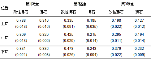 兩種沸石濕地第2隔室中上層前端和后端吸附量差距較大,說(shuō)明NH4+-N粒子進(jìn)入第2隔室后,先于第2隔室前端流至底層再向上層返混所致,這也解釋了第2隔室作為下向流,氮素平均截留量與第3隔室一樣,呈現(xiàn)出下層>中層>上層的規(guī)律,且同層吸附量差距不大.改性沸石各隔室中段平行的3根填料采樣管中,有粗壯根系的采樣管氮素平均截留量比無(wú)粗壯根系的采樣管多11.59%,粗壯根系的導(dǎo)流作用使周圍填料與同層填料相比能接觸更多的氮素,從而獲得更高的截留量,這是除流態(tài)影響外,相同區(qū)域吸附量差異的另一因素.