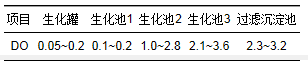 為進一步研究系統各反應單元的實際運行狀態,對每個反應單元的DO進行24 h連續監測,結果如表 2所示.生化罐和生化池1內溶解氧較低,其DO均低于0.5 mg·L-1,生化池2和生化池3的DO濃度較高,一般維持在1~4 mg·L-1.其原因在于進水有機物濃度較高,異養菌在曝氣條件下快速降解有機物并消耗大量溶解氧,導致在系統前段(生化罐和生化池1)溶解氧明顯低于設定值.隨著有機物的消耗,系統后段(生化池2和生化池3)的DO濃度逐漸上升.通過核算發現生化罐和生化池1中硝酸鹽濃度分別降低1.82 mg·L-1和1.67 mg·L-1,而在生化池2和生化池3中硝酸鹽濃度略有上升,但總氮呈降低趨勢,系統中可能存在好氧反硝化菌群.研究表明不同菌屬的好氧反硝化菌對DO的耐受能力存在顯著差異,大部分好氧反硝化菌在DO濃度低于3 mg·L-1時仍具有較高的反硝化活性.根據系統氮平衡分析,生化罐和生化池1中的同步硝化反硝化現象明顯強于生化池2和生化池3,其原因可能基于以下兩方面:第一,系統前段C/N明顯高于后段,較高的C/N能保證充足的碳源,進而有利于反硝化反應順利進行,Ahmad也在研究中發現,好氧反硝化菌的反硝化活性同樣隨著C/N的升高而增大;第二,較低的DO濃度有利于活性污泥絮體內部形成缺氧微環境,從而使缺氧反硝化與好氧反硝化相協同,進一步強化同步硝化反硝化效果.