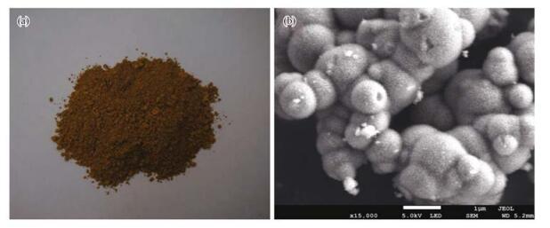 化學合成的施氏礦物如圖 1,呈棕黃色,與自然界中的施氏礦物顏色基本一致[5].對其過200目篩(孔徑0.075 mm),保存備用. 圖 1(b)為合成的施氏礦物在電子掃描顯微鏡放大5 000倍的SEM圖,從中可以看出該礦物成細小球狀,顆粒輪廓圓滑,根據電子掃描顯微鏡圖譜的比例尺得出,粒徑大概在300~1 000 nm之間,與王鶴茹等采用化學法合成的施氏礦物粒徑(600~800 nm)接近.