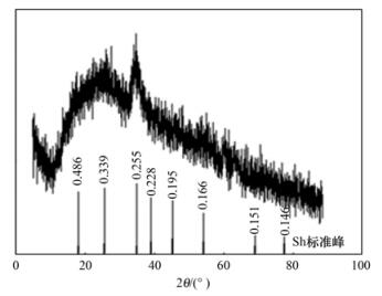 XRD圖譜如圖 2.根據標準施氏礦物(PDF47 177),所有的峰對應的d值為0.486、0.339、0.255、0.228、0.195、0.166、0.151、0.146;根據2dsinθ=λ,算出對應的2θ值為18.360°、26.258°、35.150°、39.476°、46.516°、55.272°、70.300°、78.952°.典型衍射峰位于2θ=35.15°處,出現位置與標準峰基本一致,說明合成產物為施氏礦物.此外,XRD譜線有很多毛刺,表明其結晶度較差或者是無定型礦物.