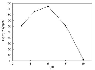 施氏礦物吸附去除Cr (Ⅵ)過程中pH值的影響見圖 9.可以看出當pH值在3~6之間時,Cr (Ⅵ)的去除率隨pH值升高而增大;pH值在6~10之間時,Cr (Ⅵ)的去除率隨pH值的升高而下降,pH值的變化對施氏礦物去除Cr (Ⅵ)的影響較大.可以看出當pH值處于4.5~6之間時,Cr (Ⅵ)的去除效果較好,pH值為6時,Cr (Ⅵ)去除效果最好,去除率高達93.11%,而強酸和強堿性條件都不利于施氏礦物去除Cr (Ⅵ).陳福星[19]認為pH在2~7范圍內,生物合成施氏礦物對Cr (Ⅵ)的去除效率隨著pH值升高而提高,而當pH > 7時,去除效率隨著pH的升高而降低;Antelo等研究發現在pH為4.5、7.0、8.0、9.0條件下,pH為4.5時,透析法合成施氏礦物對Cr (Ⅵ)去除能力最強.