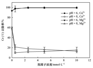 圖 13為典型陽離子Ca2+、Mg2+在pH=6和pH=8時對施氏礦物吸附Cr (Ⅵ)的影響.從中可以在看出pH=6的條件下,Ca2+、Mg2+對施氏礦物去除Cr (Ⅵ)基本無影響.在pH=8時,Ca2+、Mg2+的存在對施氏礦物去除Cr (Ⅵ)起到明顯的抑制作用,Cr (Ⅵ)的去除率從59%下降至20%左右.造成這種現象的原因可能是,弱堿性環境中,施氏礦物表面容易吸附陽離子,Ca2+、Mg2+以及生成的CaOH+、MgOH+被吸附到施氏礦物表面,導致其對Cr (Ⅵ)的吸附減少,即該條件下主要是靜電吸附作用影響的.同時,對比Ca2+和Mg2+對施氏礦物吸附Cr (Ⅵ)的影響時可以看出,當Ca2+和Mg2+的含量小于8 mmol·L-1時,Ca2+的抑制作用比Mg2+明顯,這主要是與它們的吸附能力有關,Ca2+和Mg2+的吸附能力順序為Ca2+>Mg2+[30],由于該條件下施氏礦物表面帶負電荷,所以Ca2+要比Mg2+與施氏礦物吸附能力強.具體參見污水寶商城資料或http://www.xhxdt.com更多相關技術文檔。