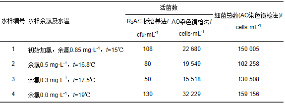 總余氯與自由余氯:使用HACH46 700-001型總氯-余氯儀;HACH-DPD自由余氯測(cè)定藥劑,HACH-DPD總余氯測(cè)定藥劑.濁度:HACH2100AN型濁度儀.細(xì)菌總數(shù)和活菌數(shù):使用Olympus-BX51型熒光顯微鏡,采用吖啶橙(acridine orange)染色鏡檢.