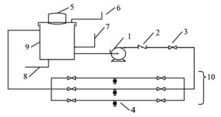 1.離心泵;2.止回閥;3.閘閥;4.取樣龍頭;5.密封與平衡裝置;6.加藥管;7.進(jìn)水管;8.排水管;9.循環(huán)水箱;10.管網(wǎng)示意