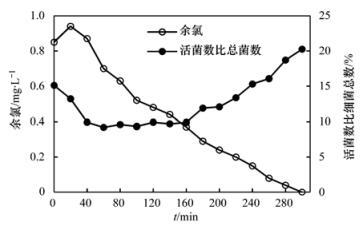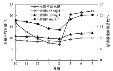 3.2 細(xì)菌數(shù)量和整體活性受理化指標(biāo)影響的變化規(guī)律3.2.1 細(xì)菌數(shù)量和整體活性受余氯影響的變化規(guī)律