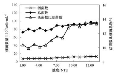 余氯約為0.3 mg·L-1時(shí)不同濁度下的計(jì)數(shù)結(jié)果(圖 8),濁度最大值2.28 NTU,最小值1.64 NTU,相差0.64 NTU;活菌數(shù)占細(xì)菌總數(shù)的比值相應(yīng)地相差2.95%.濁度超過2 NTU時(shí),活菌數(shù)比例增大明顯.由于試驗(yàn)采用的是自建的管網(wǎng),每次運(yùn)行前雖然對(duì)管網(wǎng)進(jìn)行沖洗,但難免會(huì)有少量的搭建管網(wǎng)時(shí)殘留的管材碎屑.另外,運(yùn)行前的沖洗突然改變了管網(wǎng)的水力條件,沖刷下了管壁附著的細(xì)菌及沉淀物質(zhì),也增加了試驗(yàn)用水的濁度.并且,試驗(yàn)用水引自的管網(wǎng)是年代較遠(yuǎn)的傳統(tǒng)管材管網(wǎng),其中的水自身濁度較高.上述原因造成了試驗(yàn)水濁度基本高于0.5 NTU.