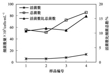在封閉循環(huán)試驗(yàn)結(jié)束后,保持主干管流量為1 m3·h-1運(yùn)行(采用非循環(huán)方式)18 h,分別在試驗(yàn)管網(wǎng)始端管段的上游和下游龍頭取水樣(樣品1和2),之后迅速旋該管段上下游閥門至開啟度最大,并同時(shí)在這兩個(gè)龍頭再取水樣(樣品3和4),分別測(cè)定4個(gè)水樣中活菌數(shù)和細(xì)菌總數(shù),測(cè)定結(jié)果見圖 10.可見流速的突然增大從管壁上沖刷下生物膜,引起了水中細(xì)菌數(shù)量的增多,尤其是活菌數(shù)量的增幅更大,導(dǎo)致水中整體細(xì)菌活性增強(qiáng).因此,盡量避免引起流速突變(如水錘等現(xiàn)象),防止管網(wǎng)中流速突然增大,也是控制飲用水中細(xì)菌數(shù)量激增的有效措施.
