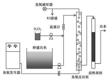 本實(shí)驗(yàn)中臭氧發(fā)生系統(tǒng)包括臭氧發(fā)生器(OS-1N, Mitsubishi Electric Co. Japan)和制氧機(jī)FY3(北京北辰科技公司).臭氧反應(yīng)柱采用DN130 mm的不銹鋼柱(壁厚3 mm),臭氧擴(kuò)散器采用鈦板微孔曝氣,有效高度Heffective=1 500 mm,總高度2 000 mm,有效容積17.8 L,實(shí)際水力停留時(shí)間約為5 min.反應(yīng)器底部設(shè)取樣口.活性炭柱(有效高度=1.0 m,直徑DN=0.13 m,體積=12 L),活性炭取自某水廠運(yùn)行2 a以上的活性炭濾池.