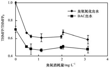圖 3為在常規(guī)工藝后利用O3-BAC深度處理工藝控制THMFP的效果,THMFP/THMFP0代表臭氧氧化工藝段及BAC處理工藝段出水中THMFP相對(duì)于常規(guī)工藝砂濾出水的剩余率.當(dāng)不投加臭氧時(shí),BAC出水剩余率將近71%,當(dāng)臭氧消耗量從0增加到1.0 mg·L-1,臭氧氧化及BAC兩工藝段出水的剩余率分別達(dá)到61%和47%,說明臭氧的氧化促進(jìn)了后續(xù)BAC對(duì)THMs前驅(qū)物的去除效果,這可能與臭氧氧化生成了更多小分子有機(jī)物如醛、酮、羧酸類物質(zhì)有關(guān).在此基礎(chǔ)上繼續(xù)增加臭氧投加量對(duì)THMFP并沒有進(jìn)一步的去除.