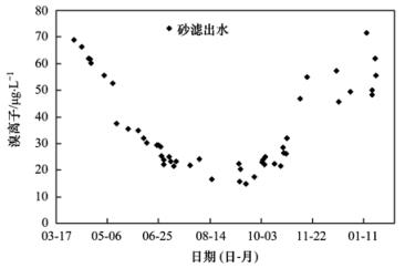 表 1為該水源原水與常規(guī)工藝出水即砂濾工藝段出水水質(zhì)指標(biāo),從中可以看出,水中氨氮含量較低,原水在0.09 mg·L-1以下,有機(jī)物及溴離子濃度變化范圍較大,水源中溴離子濃度范圍為14.92~71.7 μg·L-1,溴離子濃度隨時(shí)間和季節(jié)變化規(guī)律明顯,如圖 2所示,從3月開始,溴離子濃度開始逐漸降低,7~9月溴離子濃度達(dá)到最低,約為20.53 μg·L-1左右,之后又逐漸升高,溴離子濃度隨季節(jié)變化可能與夏季降水的稀釋作用有關(guān).