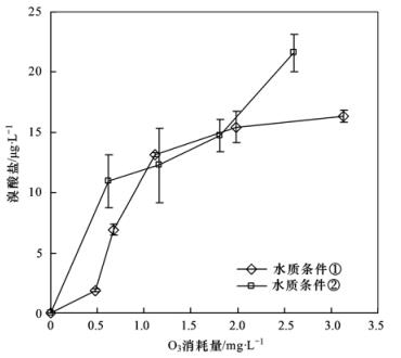 該水源原水中含有一定量溴離子,氨氮含量較低,砂濾出水平均為0.02 mg·L-1,在應(yīng)用臭氧過程中存在溴酸鹽生成與超標(biāo)風(fēng)險(xiǎn),圖 4為不同水質(zhì)條件下臭氧氧化生成溴酸鹽的情況,從中可以看出,臭氧氧化過程中有溴酸鹽生成,且存在超標(biāo)風(fēng)險(xiǎn).臭氧在水中能夠發(fā)生分解鏈反應(yīng)生成羥基自由基,臭氧分子與羥基自由基共同氧化溴離子,導(dǎo)致溴酸鹽的生成.然而當(dāng)水中有機(jī)物和溴離子濃度變化時(shí),溴酸鹽生成量有一定程度的變化.當(dāng)在水質(zhì)條件①時(shí),DOC含量較高,而溴離子濃度較低,當(dāng)臭氧消耗量達(dá)到1.0 mg·L-1左右時(shí),溴酸鹽生成量超過標(biāo)準(zhǔn),而當(dāng)消耗量達(dá)到2.0 mg·L-1左右時(shí),溴酸鹽生成15.42 μg·L-1.在水質(zhì)條件②時(shí),溴離子濃度升高,DOC濃度下降,雖然溫度有所降低,但消耗0.6 mg·L-1的臭氧即可生成10.95 μg·L-1的溴酸鹽,在2.6 mg·L-1的臭氧量下溴酸鹽生成量21.60 μg·L-1.溴酸鹽的生成與不同的水質(zhì)因素有直接的關(guān)系,其中溴離子濃度、有機(jī)物、氨氮、溫度等因素均會(huì)對(duì)其生成產(chǎn)生影響,溴離子、有機(jī)物濃度及溫度升高均會(huì)促進(jìn)溴酸鹽的生成,而氨氮濃度的增加可能導(dǎo)致溴酸鹽生成量減少.該水源水在應(yīng)用臭氧氧化過程中,溴酸鹽的生成風(fēng)險(xiǎn)較高,需對(duì)其進(jìn)行控制.