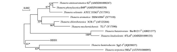 經過5輪固-液分離培養基轉接,得到菌株HDD1.在顯微鏡視野下,細菌的形態呈統一的桿狀;16S rRNA基因測序結果中不存在噪聲信號,這表明菌株HDD1為純培養.提交長度為1 397bp的16S rRNA基因序列到數據庫進行比對分析,結果顯示HDD1與Thauera aminoaromatica S2的相似度最高,達到98.7%.進化樹結果顯示HDD1在Thauera屬中形成一個單源的進化枝,并與Thauera humireducens和Thauera terpenica形成一個進化群(圖 1).用最大似然算法對系統進化樹驗證,得到相同結果.這些結果表明菌株HDD1可能是Thauera屬的一個新種,但是還需多相分類結果進行驗證.