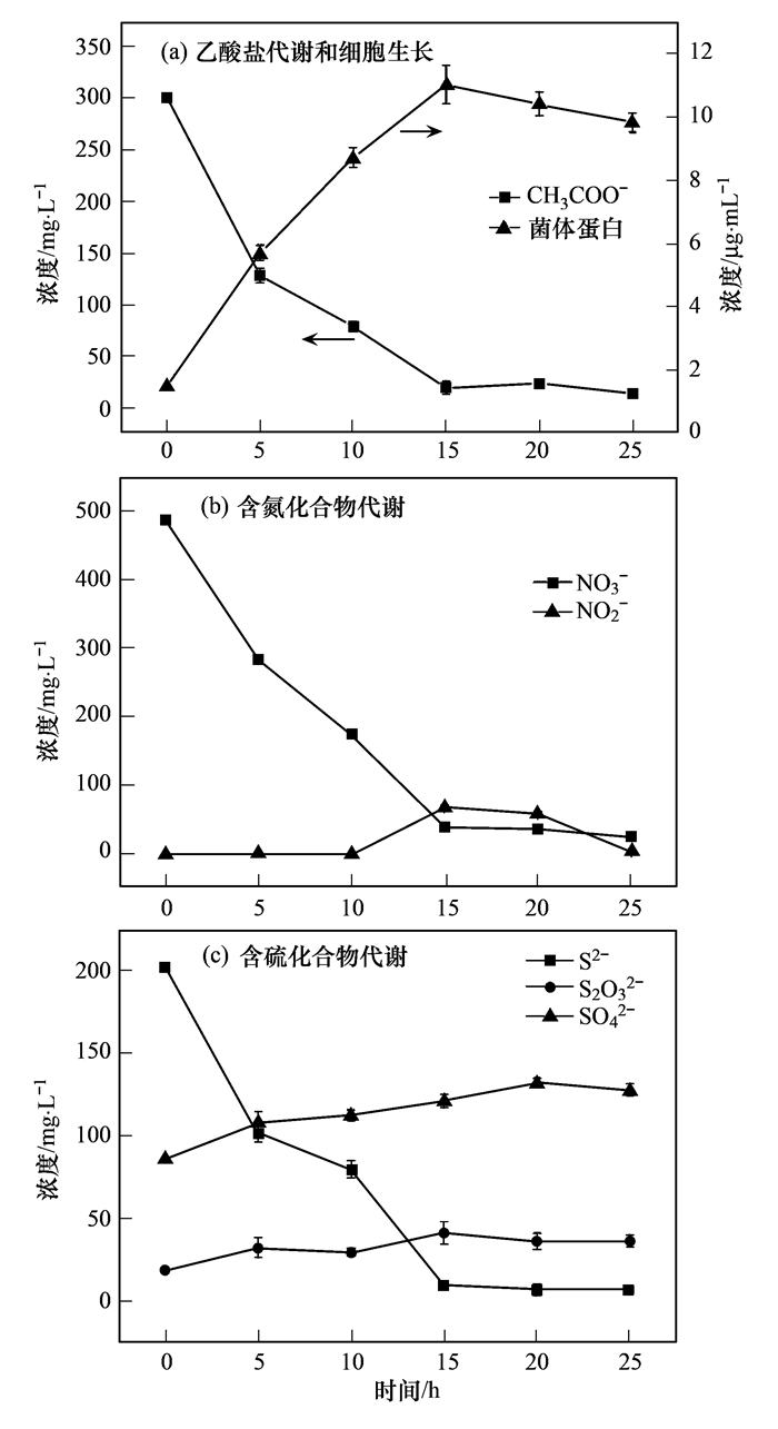 細菌經離心收集后,用磷酸鹽緩沖液清洗3次,用2.5%戊二醛固定30min.用30%、50%、70%、90%、100%的乙醇脫水后,以飽和叔丁醇做介質進行真空干燥.利用掃描電子顯微鏡(Quanta 200 FEG,FEI,美國)觀察細胞形態.利用生化試劑條(API 20NE,BioMérieux,法國)檢測菌株的生理特征.細胞經過標準革蘭氏染色后,用氫氧化鉀消散法復檢[25].菌體蛋白濃度測定采用Bradford Protein Assay Kit (Takara,日本)的標準方法.CH3COO-、NO3-、NO2-、SO42-和S2O32-的濃度由離子色譜(ICS-90A,DIONEX,美國)測定.S2-的測定采用標準亞甲基藍分光光度法.利用能量散射譜儀(EDAX,美國)測定單質硫及其含量.菌株的16S rRNA基因序列的GenBank登錄號為KX242545.