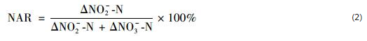 式中,ΔNO2--N表示出水NO2--N濃度與進水NO2--N濃度之差,ΔNO3--N表示出水NO3--N濃度與進水NO3--N濃度之差.