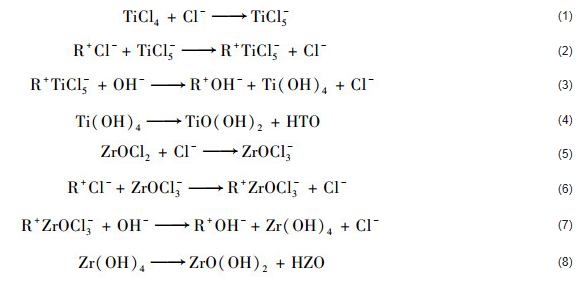 TiCl4和ZrOCl2在高濃度鹽酸溶液中以TiCl5-和ZrOCl3-陰離子形式存在,并通過離子交換與D201結合,然后經堿溶液沉淀、熱處理固化形成鈦和鋯的水合氧化物(以HTO和HZO表示),反應化學方程式如下.