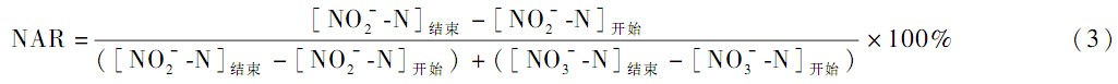 由于實驗過程中每周期換水后系統剩余少量 NO -2 -N、NO -3 -N,因此以每周期反應開始和結束時 NO -2 -N 和 NO -3 -N 濃度計算生成量,以評價亞硝酸鹽積累率,按式(3)計算: