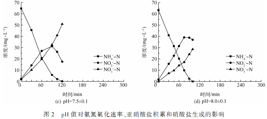 2. 2 pH 值對氨氮氧化速率、亞硝酸鹽積累和硝酸鹽生成的影響
