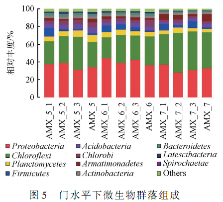 高通量分析結(jié)果見(jiàn)圖 5。 在第 106、116 和 126 天,分別從反應(yīng)器不同高度處取泥,共計(jì) 12 個(gè)樣,進(jìn)行高通量測(cè)序,其中 AMX_5 / 6 / 7,AMX_5_1 / 6_1 / 7_1,AMX_5_2 / 6_2 / 7_2,AMX_5_3 / 6_3 / 7_3 分別對(duì)應(yīng)取樣口高度 7, 37, 27, 17 cm。 結(jié)果表明,在同一進(jìn)水NH +4 -N 濃度下,ANAMMOX 菌所屬的 Planctomycetes(浮霉菌門(mén))在不同高度下的含量與去除率有著緊密的聯(lián)系,例如,進(jìn)水 NH +4 -N 濃度 200 mg·L - 1時(shí),菌群含量在反應(yīng)器底部 7、17 cm 處較 27、37 cm 略高,7cm 處浮霉菌門(mén)所占比例最大,為 7. 8% ;然而,當(dāng)進(jìn)水 NH +4 -N 濃度提至250、350 mg·L - 1時(shí),高度27、37cm 處所含 ANAMMOX 菌含量相對(duì)較高,2 種濃度下浮霉菌所占最大比例均在 27 cm 處,為 6. 1% 。