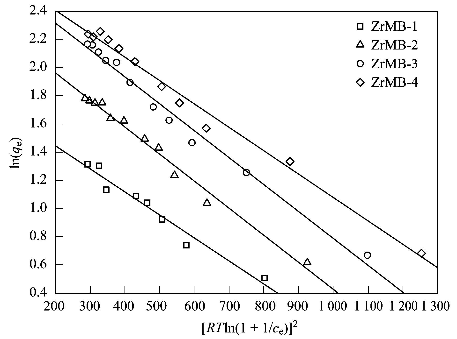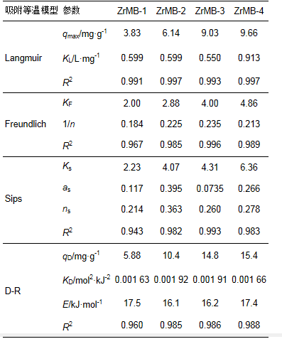 式中, qe為吸附劑對水中吸附質的單位吸附量(mg·g-1); ce為平衡時刻水中吸附質的濃度(mg·L-1); qmax為吸附劑對水中吸附質的最大單層單位吸附量(mg·g-1); KL為Langmuir吸附常數(L·mg-1); KF和1/n均為Freundlich吸附常數.采用公式(6) 和(7) 對圖 4實驗數據進行擬合, 結果見表 3.根據計算得到的等溫吸附模型參數, 計算得到qe對ce曲線, 結果亦見圖 4.由表 3和圖 4可見, Langmuir和Freundich等溫吸附模型均可以用于擬合不同鋯負載量鋯改性膨潤土對水中磷酸鹽的吸附平衡實驗數據.根據Langmuir模型, ZrMB-1、ZrMB-2、ZrMB-3和ZrMB-4這4種鋯改性膨潤土對水中磷酸鹽的最大單層單位吸附量(以P計)分別被預測為3.83、6.14、9.03和9.66 mg·g-1.顯然, 鋯改性膨潤土對水中磷酸鹽的最大單層單位吸附量隨著鋯負載量的增加而增加, 并且當ZrO2負載量由3.61%增加13.15%時鋯改性膨潤土的最大單層單位吸附量顯著增加, 而繼續增加鋯負載量時鋯改性膨潤土的最大單層單位吸附量則緩慢提高. Freundlich模型的參數KF與吸附容量直接相關, 通常KF越大, 吸附容量越高.本文計算得到的KF值的排序為:ZrMB-1 考慮到Langmuir和Freundlich等溫吸附模型均可以用于擬合本文的實驗數據, 因此通過這2個模型很難確定鋯改性膨潤土和磷酸鹽之間相互作用的類型.為此, 本文進一步采用Sips等溫吸附模型對圖 4實驗數據進行擬合. Sips模型是Langmuir和Freundlich模型的組合.當水中吸附質濃度較高時, Sips模型可以像Langmuir模型那樣預測最大單層單位吸附量; 當水中吸附質濃度較低時, Sips模型可以像Freundlich模型那樣描述吸附劑對水中較低濃度吸附質的吸附行為. Sips等溫吸附模型的數學表達式見公式(8) . 式中, qe(mg·g-1)和ce(mg·L-1)分別為吸附劑對水中吸附質的平衡單位吸附量和平衡時刻水中吸附質的質量濃度; Ks、as和ns均為Sips等溫吸附模型參數. ns可以用來表征吸附劑表面的不均勻性; 如果ns小于1, 則吸附劑表面的吸附位是不均勻的, 并且ns越小, 吸附劑表面越不均勻; 如果ns接近或等于1, 則吸附劑表面的吸附位是均勻的.采用公式(8) 對圖 4實驗數據進行擬合, 擬合結果見表 3.根據計算得到的等溫吸附模型參數計算得到qe對ce曲線, 結果亦見圖 4.由表 3和圖 4可見, Sips等溫吸附模型可以用于描述鋯改性膨潤土對水中磷酸鹽吸附等溫實驗數據.這說明當水中磷酸鹽濃度較低時, Freundlich模型與Langmuir模型相比更適合用于描述鋯改性膨潤土對磷酸鹽的吸附行為; 當水中磷酸鹽濃度較高時, 單層吸附是鋯改性膨潤土吸附磷酸鹽的主要模式.本文計算得到的ns均小于1, 說明ZrMB-1、ZrMB-2、ZrMB-3和ZrMB-4這4種鋯改性膨潤土表面的吸附位分布是不均勻的. Langmuir、Freundlich和Sips等溫吸附模型不能識別吸附的類型, 即物理吸附或化學吸附, 而D-R等溫吸附模型則可以用來識別吸附反應的類型.線性化D-R等溫吸附模型的數學表達式為: 式中, qe和qD分別為吸附劑對水中吸附質的平衡單位吸附量和最大單位吸附量(mg·g-1); ce為水中吸附質的平衡質量濃度(mol·L-1); R為理想氣體常數[8.314 J·(mol·K)-1]; T為反應溫度(K); KD為D-R等溫吸附模型常數(mol2·kJ-2). KD被進一步用來計算平均吸附自由能(E, kJ·mol-1), 它的計算公式為: 通常情況下, 物理吸附的E值小于8 kJ·mol-1, 而化學吸附的E值則大于8 kJ·mol-1[39].公式(9) 對圖 4實驗數據的擬合曲線見圖 5, 根據圖 5計算得到的D-R等溫吸附模型參數見表 3.由圖 5和表 3可見, D-R等溫吸附模型可以用于擬合鋯改性膨潤土對水中磷酸鹽的吸附平衡實驗數據.由表 3可見, 計算得到的E值均大于8 kJ·mol-1, 這說明不同鋯負載量的鋯改性膨潤土對水中磷酸鹽的吸附均屬于化學吸附.這與根據吸附動力學研究所得到的結論是一致的. 圖 5 D-R等溫吸附模型擬合曲線 表 3 等溫吸附模型對鋯改性膨潤土吸附水中磷酸鹽吸附等溫線的擬合結果 表 4為先前研究報道過的基于水合氧化鋯吸附劑和本文報道的鋯改性膨潤土的最大磷單位吸附量.從中可以看出, ZrMB-3和ZrMB-4這2種鋯改性膨潤土的最大磷酸鹽單位吸附量大于水合氧化鋯負載陰離子交換樹脂、水合氧化鋯負載木質纖維素丁醇殘渣、鋯改性沸石和鋯改性高嶺土等基于水合氧化鋯吸附劑的最大單位吸附量, 這說明ZrMB-3和ZrMB-4這2種鋯改性膨潤土屬于磷酸鹽吸附容量較高的基于水合氧化鋯的吸附劑.對比分析ZrMB-3和ZrMB-4可以發現, 雖然ZrMB-4的ZrO2(19.63%)明顯高于ZrMB-3的ZrO2(13.15%), 可是ZrMB-4的磷酸鹽最大單位吸附量僅僅比ZrMB-3多7%左右.因此, 綜合考慮吸附劑的經濟成本和吸附容量, ZrMB-3比ZrMB-4更為合適作為吸附劑去除水中的磷酸鹽.由表 4可見, 鋯改性膨潤土中單位質量ZrO2的磷酸鹽最大吸附量隨著鋯負載量的增加而降低.當ZrO2含量從3.61%增加到19.63%時, 鋯改性膨潤土中單位質量ZrO2的磷酸鹽最大吸附量(以P/ZrO2計)由106下降到49.2 mg·g-1.從表 4可以看出, 雖然本研究所制備的鋯改性膨潤土的磷酸鹽最大單位吸附量均低于單純的水合氧化鋯, 可是鋯改性膨潤土中單位質量ZrO2的磷酸鹽最大單位吸附量卻明顯高于單純的水合氧化鋯.這說明采用膨潤土作為水合氧化鋯的載體可以明顯提高水合氧化鋯的分散度, 進而提高水合氧化鋯的利用率, 膨潤土適合作為水合氧化鋯的載體用于制備除磷吸附劑.此外, 鋯改性膨潤土中單位質量ZrO2的磷酸鹽最大吸附量明顯大于水合氧化鋯負載陰離子交換樹脂和鋯改性高嶺土中單位質量ZrO2的磷酸鹽最大