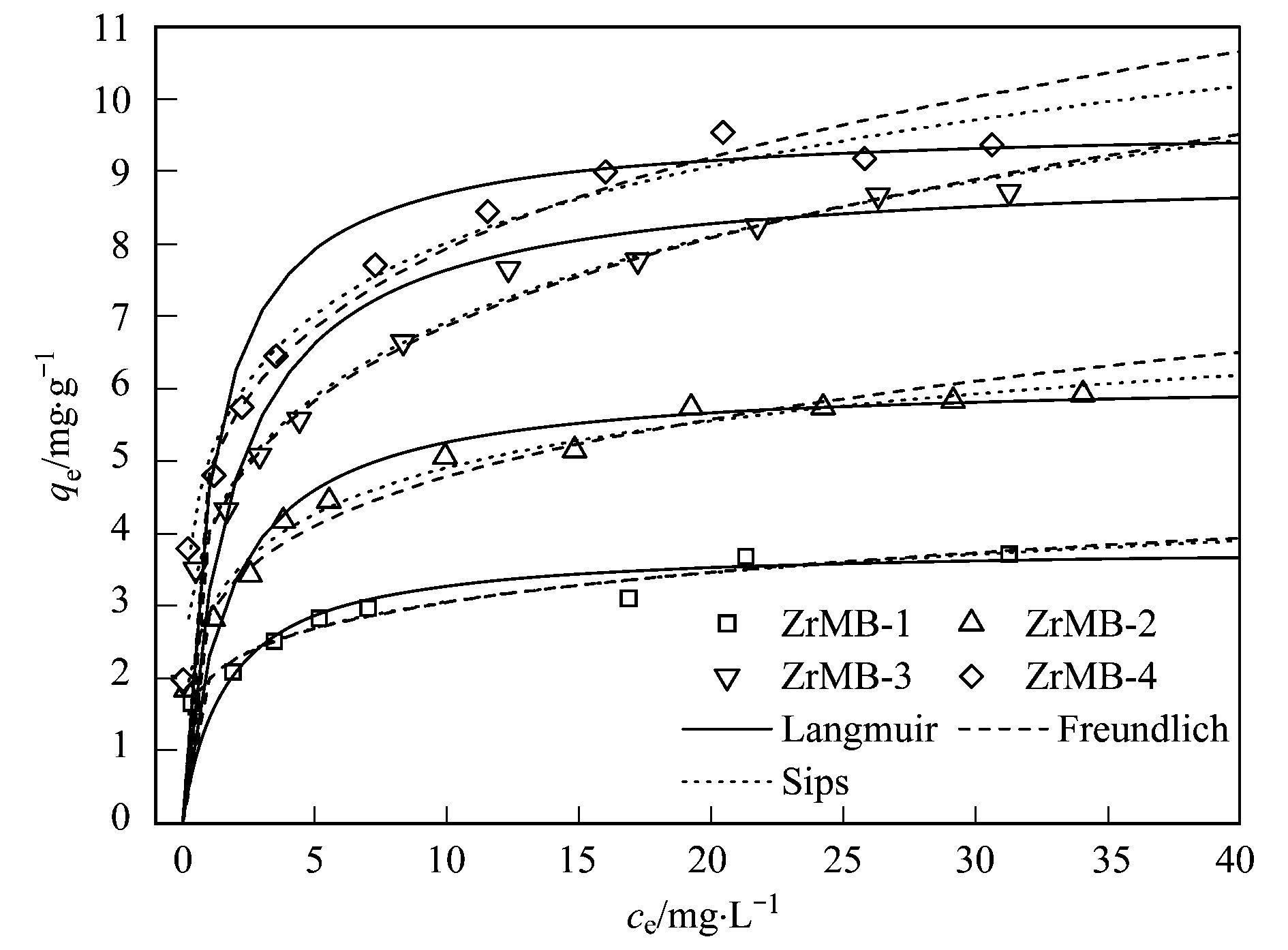 圖 4 不同鋯負載量的鋯改性膨潤土對水中磷酸鹽的吸附等溫線