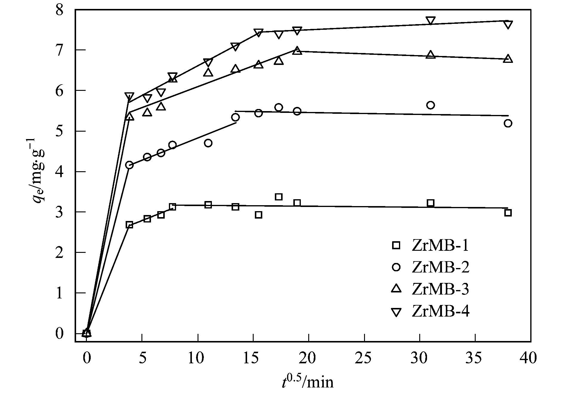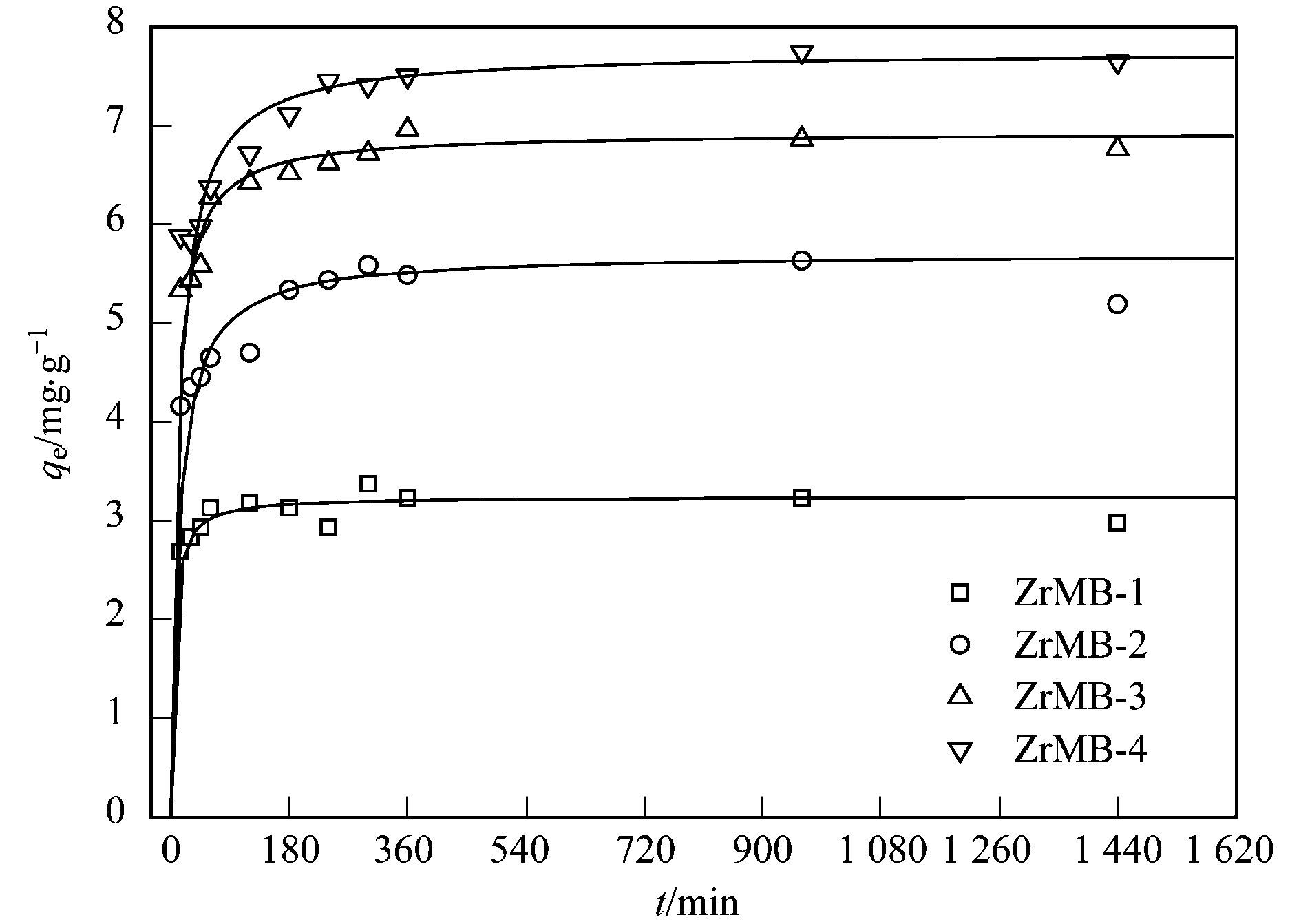 式中, qt和qe分別為t時刻和平衡時刻吸附劑對水中吸附質的單位吸附量(mg·g-1); t為反應時間(min); k2為準二級動力學模型速率常數[g·(mg·min)-1]; t1/2(min)為半吸附時間, 即單位吸附量達到平衡時刻單位吸附量一半時所需要的時間, t1/2越小, 說明吸附速率越快.采用準二級動力學模型對圖 2實驗數據進行線性擬合, 根據擬合曲線的斜率和截距計算得到qe和k2值, 結果見表 2.進一步根據計算得到的qe和k2值計算得到不同t時刻的qt值, 并以t為橫坐標, 以計算得到的qt為縱坐標繪制曲線, 結果亦見圖 2.由表 2和圖 2可見, 不同鋯負載量的鋯改性膨潤土對水中磷酸鹽的吸附動力學可以較好地采用準二級動力學模型進行描述.這意味著鋯改性膨潤土對水中磷酸鹽的吸附反應屬于化學吸附, 即鋯改性膨潤土表面和水中磷酸鹽之間涉及共享或者交換電子進而形成了價力.計算得到的ZrMB-1、ZrMB-2、ZrMB-3和ZrMB-4的t1/2分別為4.47、12.4、7.92和11.7 min, 這說明不同鋯負載量的鋯改性膨潤土對水中磷酸鹽的吸附速率是很快的.從動力學的角度看, 鋯改性膨潤土適合作為吸附劑吸附水中的磷酸鹽.