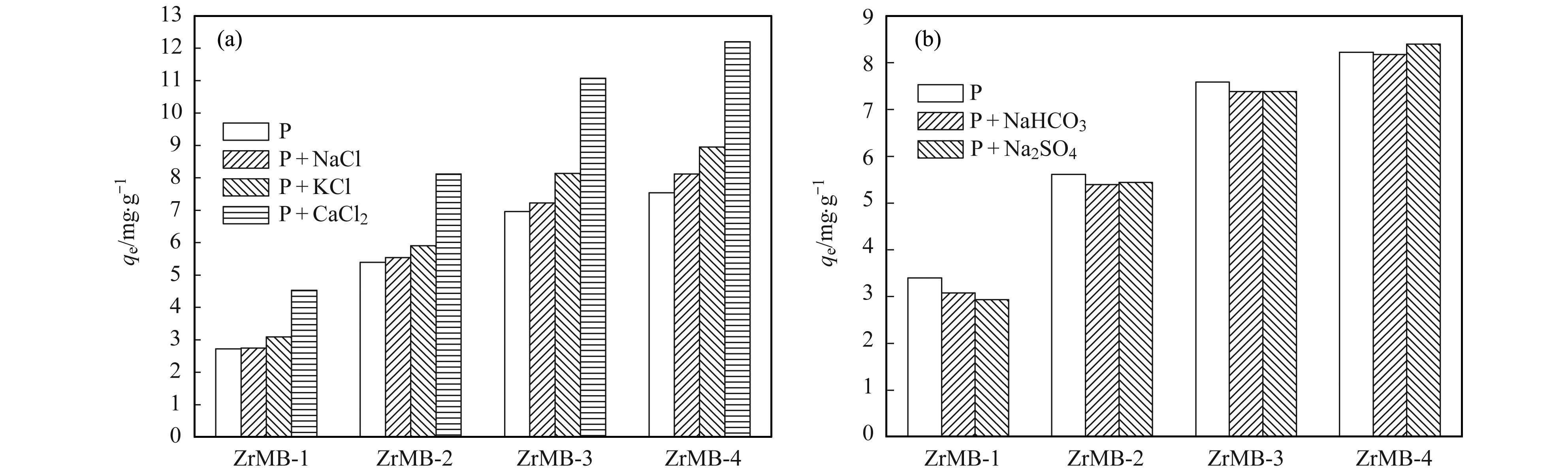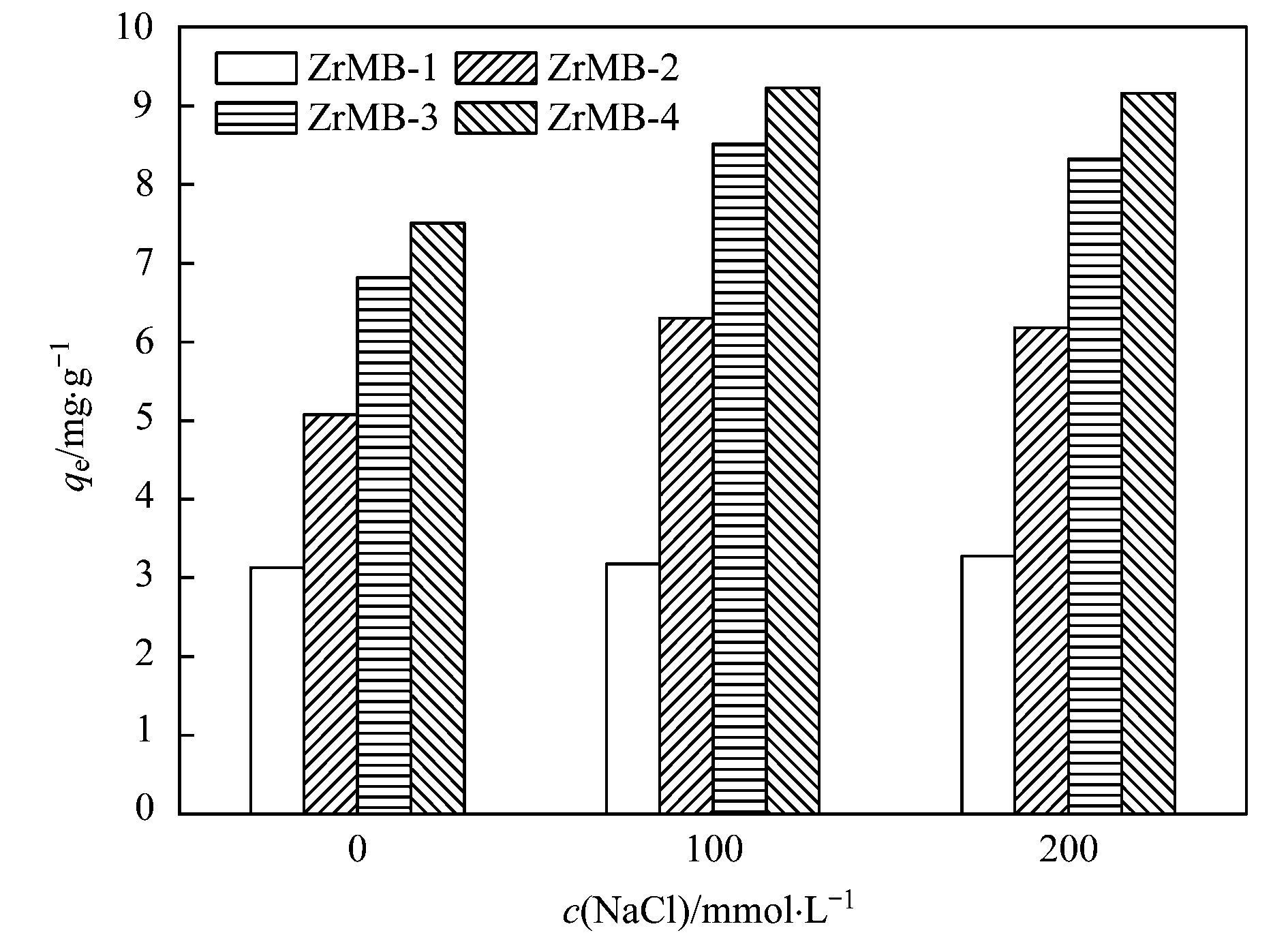 為制備不同鋯負載量的鋯改性膨潤土, 本研究采用不同投加劑量的八水氧氯化鋯對膨潤土進行改性.考慮到八水氧氯化鋯和膨潤土的價格, 本研究制備鋯改性膨潤土時考察的八水氧氯化鋯和膨潤土質量比范圍為0.1~0.5.具體制備過程為:分別取4個500 mL錐形瓶, 向每個錐形瓶中各加入10 g膨潤土, 再分別向每個錐形瓶中加入1、2、3、5 g八水氧氯化鋯, 然后向每個錐形瓶中各加入100 mL去離子水, 接著將所有的錐形瓶置于恒溫水浴振蕩器中反應30 min(轉速為150 r·min-1, 溫度為25℃); 然后再將錐形瓶從恒溫水浴振蕩器中取出再置于磁力攪拌器中, 采用1 mol·L-1的NaOH溶液將每個錐形瓶中的混合液pH值調至10;緊接著將每個錐形瓶置于25℃恒溫水浴振蕩器中以150 r·min-1的速度繼續反應24 h, 再離心清洗各錐形瓶中的固體材料, 直至上層清液的pH值約為7;最后將所得固體材料置于烘箱中105℃條件下烘干, 破碎后即可得到不同鋯負載量的鋯改性膨潤土.將八水氧氯化鋯/膨潤土質量比為0.1、0.2、0.3和0.5時所制備的鋯改性膨潤土分別記為ZrMB-1、ZrMB-2、ZrMB-3和ZrMB-4.