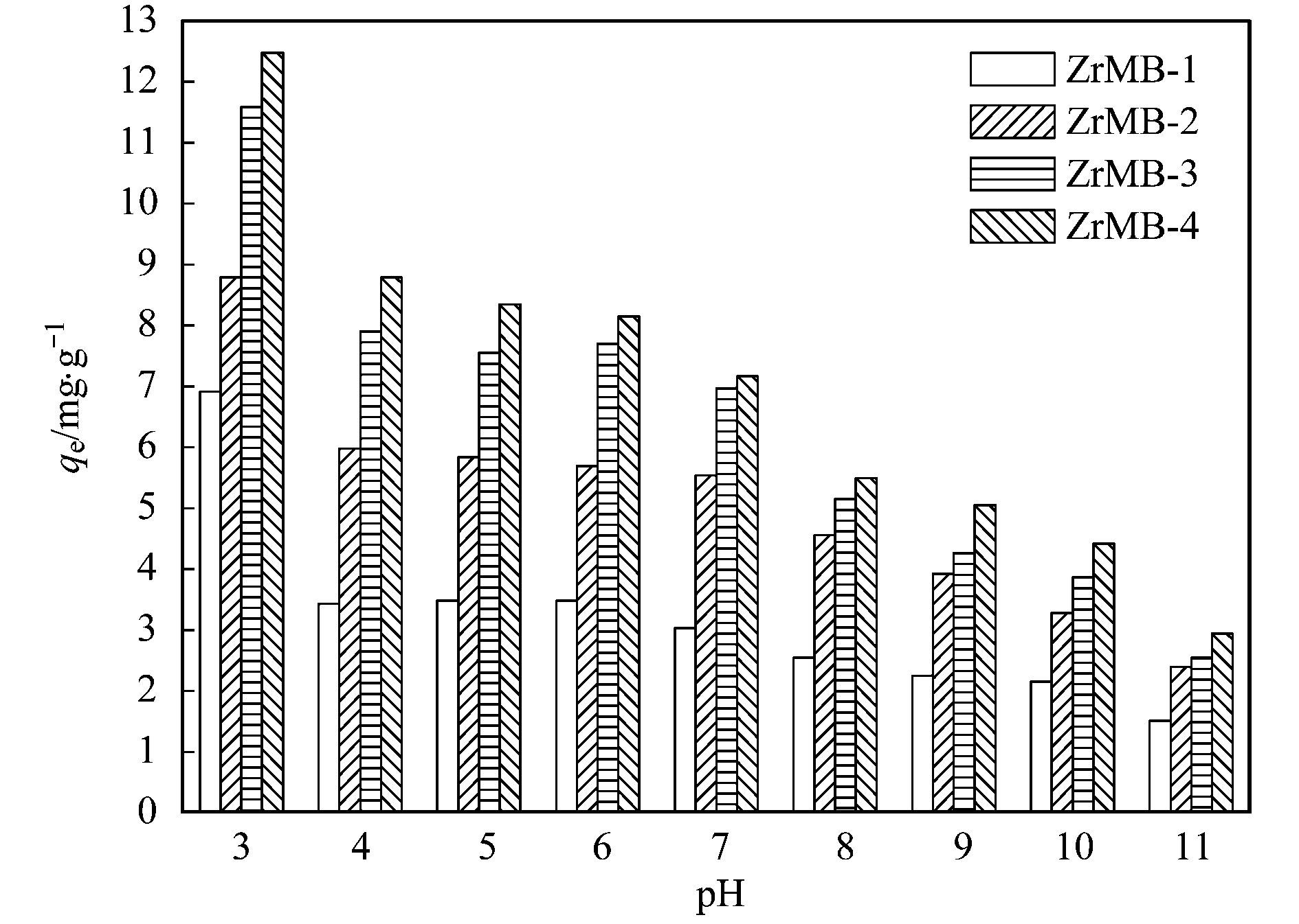 圖 1為不同鋯負載量的鋯改性膨潤土的pHi-pHf與pHi之間的關系.從中可見, ZrMB-1、ZrMB-2、ZrMB-3和ZrMB-4這4種鋯改性膨潤土的pHPZC值分別為7.14、7.33、7.34和7.34.當溶液初始pH值等于pHPZC時, 鋯改性膨潤土表面既不消耗溶液中的H+, 也不消耗溶液中的OH-, 此時鋯改性膨潤土表面的凈電荷值為零.從圖 1還可見, 當溶液初始pH值低于pHPZC時, 鋯改性膨潤土表面的羥基基團會通過質子化反應(M為金屬元素, 下同):