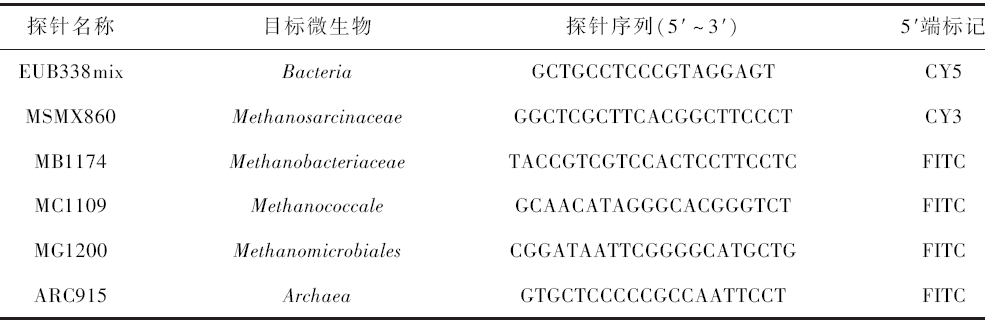 顆粒污泥中微生物種群采用熒光原位雜交(fluorescence in situ hybridization,FISH)法進(jìn)行檢測。FISH方法的具體操作步驟如下:顆粒污泥樣品固定采用4% 多聚甲醛于4 ℃ 下固定6 h,將顆粒污泥浸泡于冷凍切片包埋劑(SAKURA Tissue-Tek? O. C. T. Compound,USA) 中12 h,使包埋劑滲透至顆粒內(nèi)部。然后,將包埋的泥樣置于- 20 ℃ 下冷凍,采用冷凍切片機(Leica CM 1950,Germany)進(jìn)行切片,切片厚度為20 μm。取切片所得污泥樣品于明膠載玻片上,室溫過夜干燥。將干燥后的污泥載玻片依次置于50% 、80% 和100% (體積比)的乙醇溶液中各3 min 對細(xì)胞進(jìn)行脫水后,取出后風(fēng)干。取適量的探針使用液(探針溶液(50 ng·μL - 1 )與雜交緩沖液(去離子甲酰胺濃度為20% )按照體積比1 ∶ 8 混合,避光,于46 ℃ 中預(yù)熱數(shù)分鐘)涂于載玻片的樣品上,然后將載玻片迅速移入雜交管中,于46 ℃ 下避光雜交3 h。雜交完成后,取出載玻片進(jìn)行洗脫處理并立即風(fēng)干封片。雜交的具體操作方法依據(jù)NIELSEN 等 編寫的《FISH 操作技術(shù)手冊》和于莉芳采用的方法進(jìn)行。檢測所用寡核苷酸探針及雜交條件等見表1。采用激光掃描共聚焦顯微鏡(LEICA TCS SP8)進(jìn)行觀察。