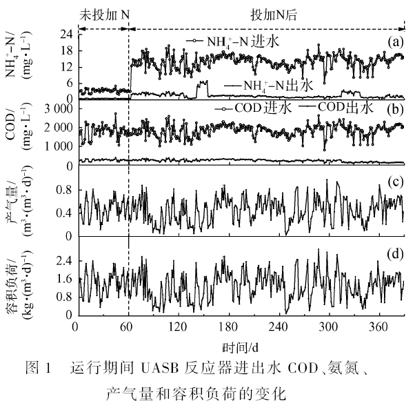 該飲料廠主要生產(chǎn)可樂、雪碧、芬達(dá)和瓶裝飲用水。UASB 的進(jìn)水為生產(chǎn)過程中產(chǎn)生的廢水和廠區(qū)生活污水的混合廢水,其中生產(chǎn)廢水主要來源于車間的洗瓶水、設(shè)備清洗水、水線的反滲透(RO)設(shè)備排出的濃水等,生產(chǎn)廢水中的污染物以糖分為主,進(jìn)水中的COD、氨氮濃度見圖1。