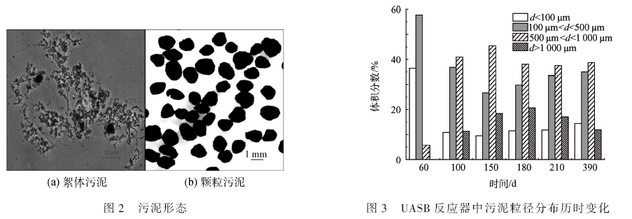 厭氧污泥粒徑分布采用激光衍射粒度儀(LS230 / SVM,BECKMEN,USA) 進(jìn)行測定,粒度測定范圍為0 ~ 2 000 μm。